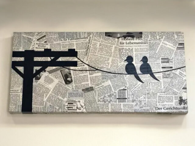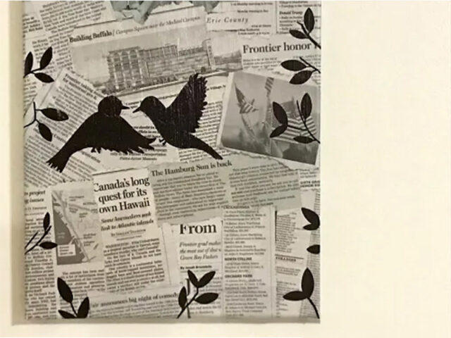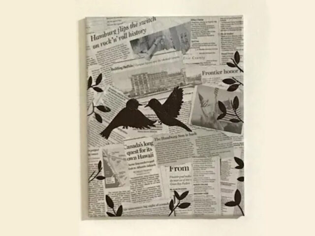 - For my German newspaper canvas above, I drew birds on a telephone pole. For my French and Czech Republic paper I painted birds flocking together on a huge tree. For this New York newspaper canvas I decided to make two love birds with some branches and leaves just framing them in.