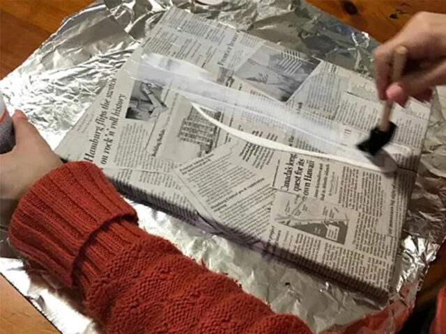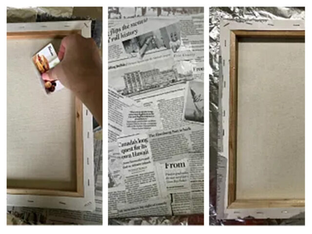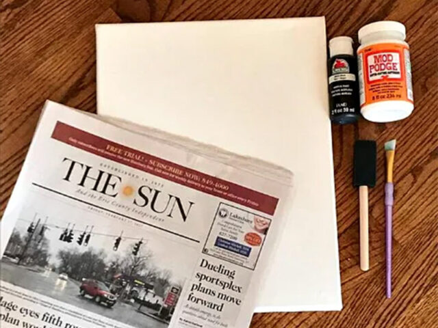 - Use Mod Podge® just as you would glue to fasten these newspaper clippings to your canvas.