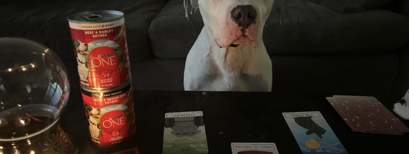 Finally, Sir Vesper turns the last card…Strength. The image shows a loyal buff dog standing tall beneath with weights and a full moon shining down on them, eyes bright, heart strong. This is the future Purina ONE has foretold.