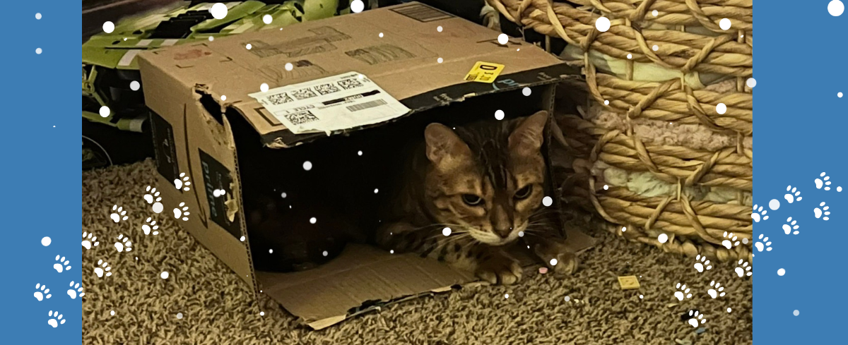 We’ve also purchased a few cat furniture pieces. This is a great way to give your pet a chance to utilize their natural instincts of climbing! We have a new cat tree that Macaroni can’t get enough of. We have a few cats in our household, so we do have multiple cat trees in our home. This is nice because Macaroni is a little much for my senior kitties at times. Everyone has their own space to explore and play! Don’t want to invest in a big cat tree? Try cutting a few holes in a cardboard box! I don’t think I’ve ever seen my cats turn down a new box to explore and play with. Crinkle up some packing paper and you will keep the entertained for at least a few hours!