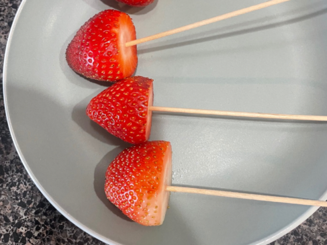 - Insert cake pop sticks or skewers into strawberries and set aside until ready for dipping.