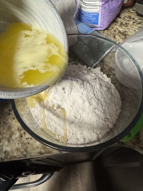 - Mix butter and cake mix – texture will be crumbly.