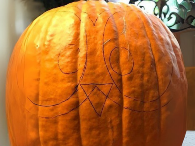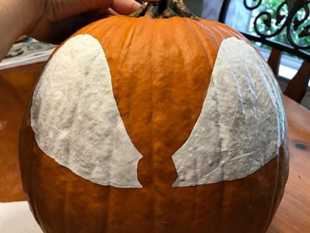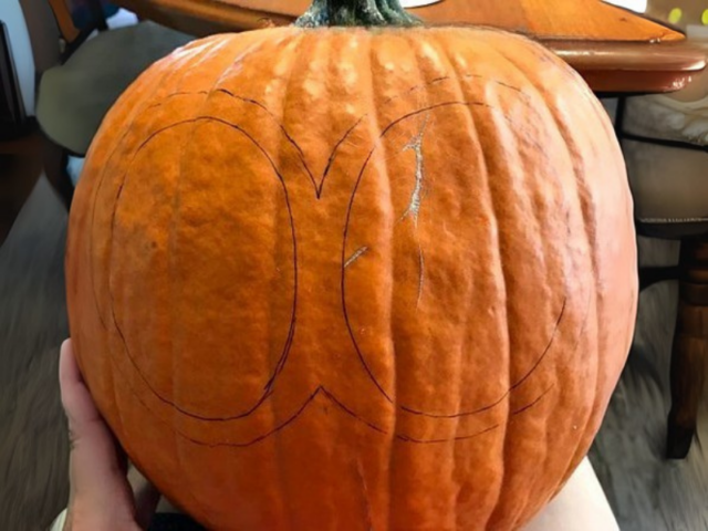 - Cut out ears using foam board. I rounded the bottoms so the foam would sit flush on my round pumpkin.
