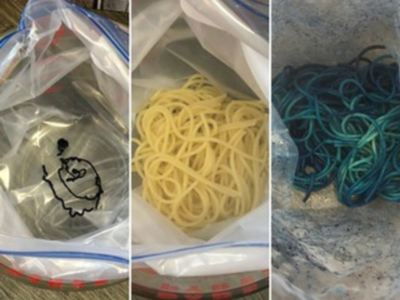 - Add a squirt of Food Coloring into the bag and 1/4 of the Spaghetti Noodles.