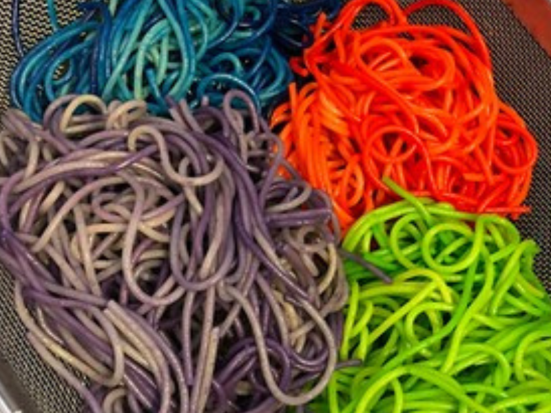 - Rinse the colored pasta in a strainer to get any remaining Food Coloring cleared off.