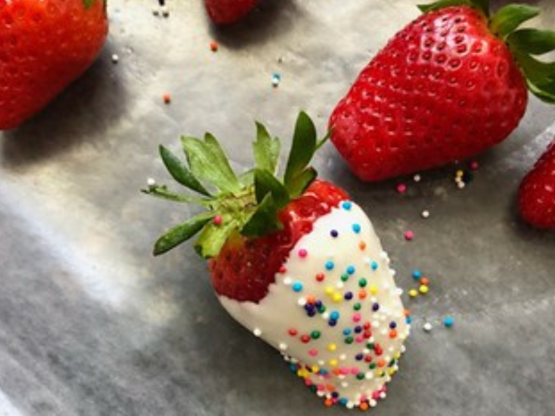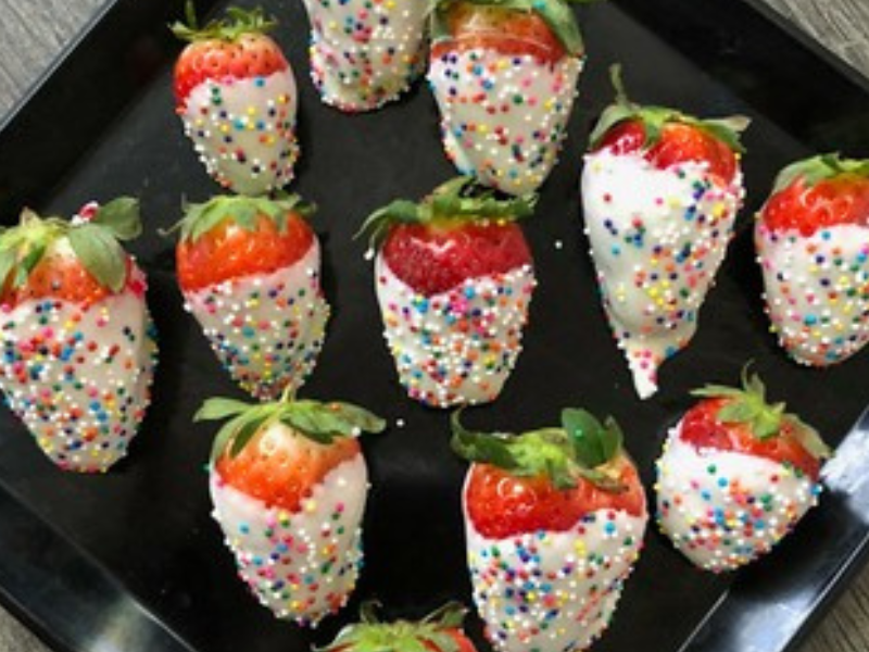 I told you these were easy! I really love how the White Chocolate hardens with the Rainbow Sprinkles to give a nice yummy crunch before you hit the juicy strawberry. These make GREAT desserts or after school snacks!