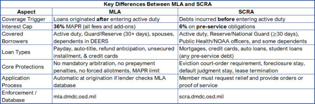 Navigating credit as a servicemember or military spouse can be tricky. Two federal laws—the Military Lending Act (MLA) and the Servicemembers Civil Relief Act (SCRA)—provide crucial safeguards to your financial well-being. While both laws serve to protect you and your financial well-being, they differ significantly in practice and scope. Understanding when they apply and what they cover will help you exercise your rights as a servicemember. Let’s look at these two laws and see how and why they are different, and how they protect you.