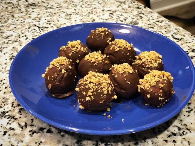 - Dip balls into melted chocolate and place them on a single layer of shallow wax paper lined pan.