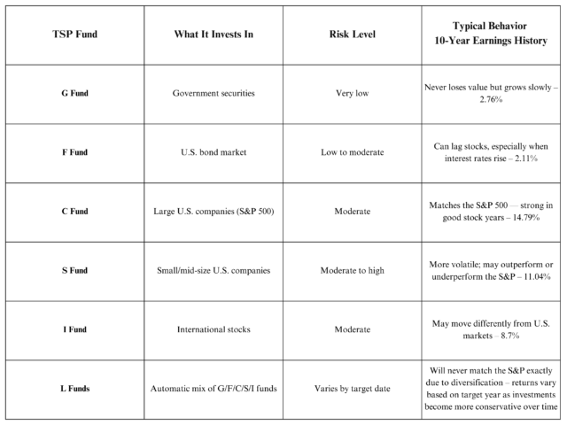 - These include the G, F, C, S, and I Funds, plus the Lifecycle (L) Funds that mix them automatically based on your target retirement date.
