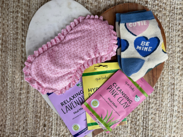 I spent under $30 grabbing a few things to romanticize the moment in a way that felt cozy and personal. Nothing over the top, just small touches that made the night feel intentional. I picked up three face mask options, a sleep eye cover, socks, and a candle. Once I got home, I also used what I already had, like my red coupe glass and some sparkling cider (or whatever floats your boat).