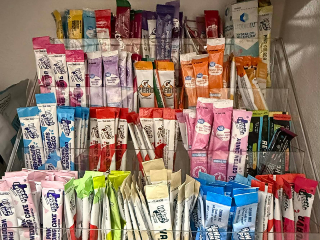 This is where the fun begins! Now that you have gathered a few tasty options, it is time to start creating your new waters! So, start by picking a drink packet and a flavored syrup to try to combine. Now, I tend to do 1 packet and a few pumps of the syrup or 2 different packets for my 32 oz. of water. This may vary for you, so get creative and have some fun with your creations!