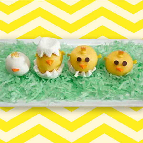 - Half-Cracked Chicks – Prepare Newborn Chicks as directed, except use only 24 marshmallows and omit marshmallow halves on tops of chicks. Add miniature chocolate chips for the eyes. Top all marshmallow halves with cookie balls; sprinkle with yellow colored sugar.